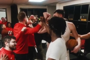 赛后更衣室内,临时主帅斯普利特将比赛用球递给砍下生涯新高的克林根,卡马拉则是球队本场最佳防守球员。
