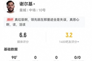 24直播网01月05日讯 曼城与英超1-1战平切尔西,谢尔基本场数据:首发踢满全场,2次射门未正,5次过人成功2次,传球成功率80.3%,对抗成功5次,获评6.6分。