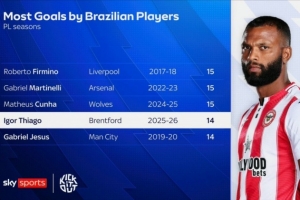 24直播网01月05日讯 英超第20轮,布伦特福德球员伊戈尔·蒂亚戈上演帽子戏法,帮助球队4-2战胜埃弗顿。本赛季他已打入14球,追平了巴西球员在英超的单赛季进球纪录。此前的纪录保持者为菲尔米诺、马丁内利和库尼亚,他们均打入15球。蒂亚戈有望创造新的历史。