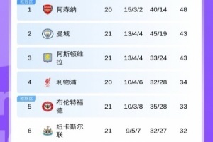 体育资讯1月8日讯 英超第21轮结束多场对阵,最新积分榜情况如上图。
