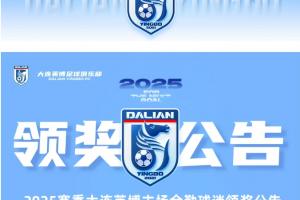 全勤包括全程参与2025赛季所有主场赛事(包含足协杯,共16个主场),球迷领取地点为:大连足球青训基地一线队楼一楼大堂,由一号门进入基地,沿指示前往一线队楼。