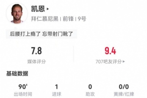 24直播网01月18日讯 拜仁5-1逆转莱比锡,凯恩首发出战表现全面。他4次射门打入1球,送出2次关键传球,传球成功率75.8%,获评7.8分。