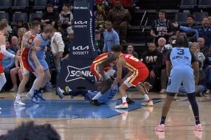 莫兰特落地后抓住球,盖耶过来抢,还跨了莫兰特!