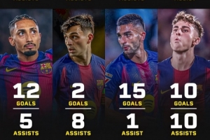 24直播网01月26日讯 西甲第21轮,巴萨主场3-0战胜奥维耶多。本赛季队内已有8名球员参与进球数达10+,其中费兰·托雷斯贡献15球1助,拉菲尼亚12球5助,亚马尔与莱万均打入11球,攻击多点开花,火力全开。