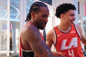 赛后,莱昂纳德在更衣室被浇水庆祝,他打趣道:“我会给你们所有人寄送账单。你们得让我去编一次头发🤣。”