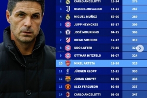 24直播网01月31日讯 阿尔特塔以325场英超达成200胜,位列五大联赛主帅单一俱乐部此项成就榜第十,场次少于克洛普。瓜迪奥拉以268场高居榜首,安切洛蒂、阿莱格里等名帅紧随其后。