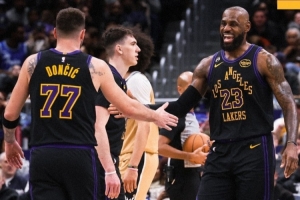 赛后湖人官方晒出赢球海报,詹姆斯和东契奇登上封面,拉拉维亚也出镜。