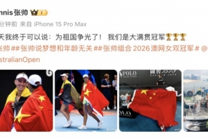 24直播网讯 张帅搭档梅尔滕斯夺得澳网女双冠军,这是她时隔七年的第三座大满贯女双冠军。赛后她更新社媒,激动地表示“为祖国争光了”,并晒照庆祝这一荣耀时刻。