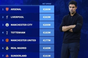 24直播网02月04日讯 据转会市场网统计,本赛季转会净支出前十中,英超六队强势包揽前五。阿森纳以2.8亿欧元居首,利物浦(2.63亿)、曼城(2亿)、热刺(1.83亿)和曼联(1.77亿)紧随其后,皇马位列第六。英超俱乐部在转会市场投入巨大,占据主导地位。