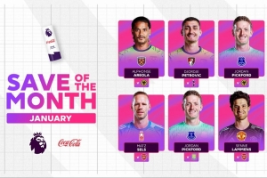 体育资讯2月5日讯 英超官方公布1月联赛最佳扑救候选,拉门斯扑苏维门迪头球在列,皮克福德两记扑救入围。