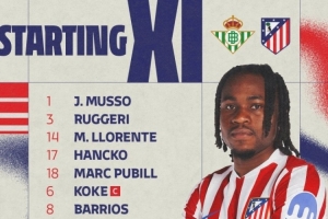 24直播网02月06日讯 马竞国王杯客场战贝蒂斯首发阵容公布:格列兹曼领衔,新援卢克曼首发,阿尔瓦雷斯替补。核心球员科克、巴里奥斯在列,门将穆索首发。奥布拉克等名将坐镇替补席。