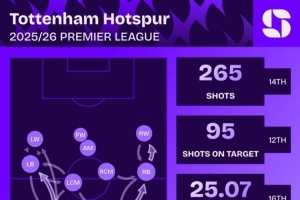 热刺本赛季英超部分数据: