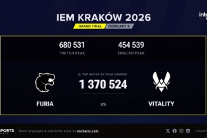 24直播网讯 IEM克拉科夫2026赛事峰值收视人数达137万,创非Major赛事新高,位列历史总榜第八。其决赛Vitality对阵FURIA最受欢迎,总观看时长超4022万小时,媒体价值近1773万美元,彰显了其巨大影响力与商业成功。