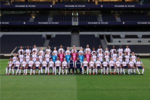 热刺官方在今日通过社媒晒出男足和女足一线队成员的合照全家福,两位主帅位列C位,男足和女足球员随机排列座次。