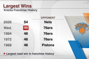 今日 尼克斯大胜76人49分(队史客场最大净胜分)
