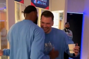 詹姆斯先后与库里、唐斯、约基奇、字母哥和东契奇进行了拥抱。