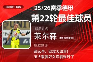 第22轮评选结果出炉,多特蒙德球员莱尔森单场助攻大四喜,赛后获评10分,助多特4-0大胜美因茨,当选【体育资讯X小红书德甲第22轮最佳球员】!