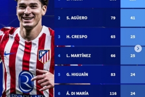 24直播网02月19日讯 欧冠附加赛马竞战平布鲁日,阿根廷前锋阿尔瓦雷斯进球。他在欧冠历史射手榜上,以35场20球的成绩位列阿根廷球员第七,仅次于梅西、阿圭罗等前辈。