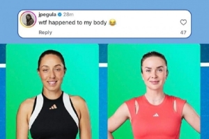 24直播网讯 WTA1000迪拜站女单决赛海报出错,P掉了佩古拉衣服的白边,导致其身材显得诡异如“面条”。佩古拉幽默吐槽自己得到了“梦寐以求的水蛇腰”,但也损失了手臂肌肉,并感谢WTA的“神P图”。