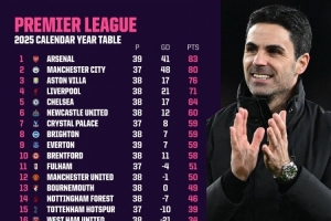 英超2025年度积分榜:阿森纳83分第一,曼城少赛2场80分排第二