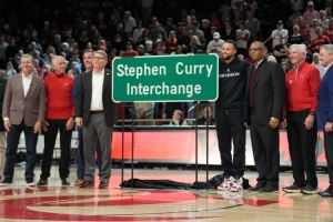 体育资讯1月1日讯 昨日库里回到了自己的母校戴维森学院,并参加了学校为他举行的庆祝活动,为“斯蒂芬·库里30号立交”揭牌并合影留念。
