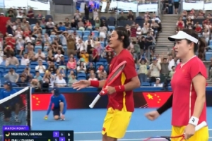 24直播网讯 网球联合杯悉尼赛区,中国混双组合朱琳/张之臻在决胜盘抢十中以10-6逆转,助中国队2-1击败比利时队,取得小组赛首胜。